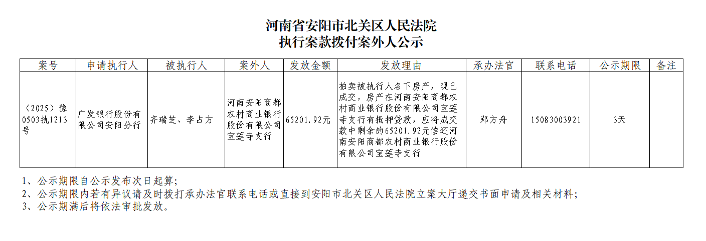 河南省安阳市北关区人民法院执行案款拨付案外人公示
