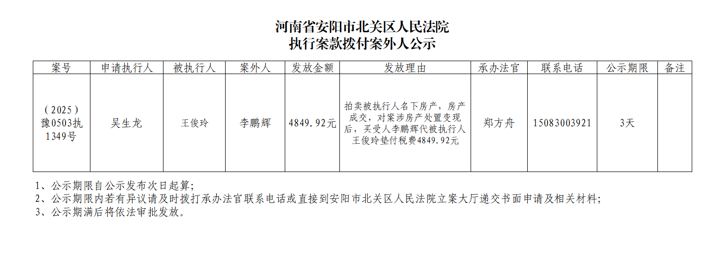 河南省安阳市北关区人民法院执行案款拨付案外人公示