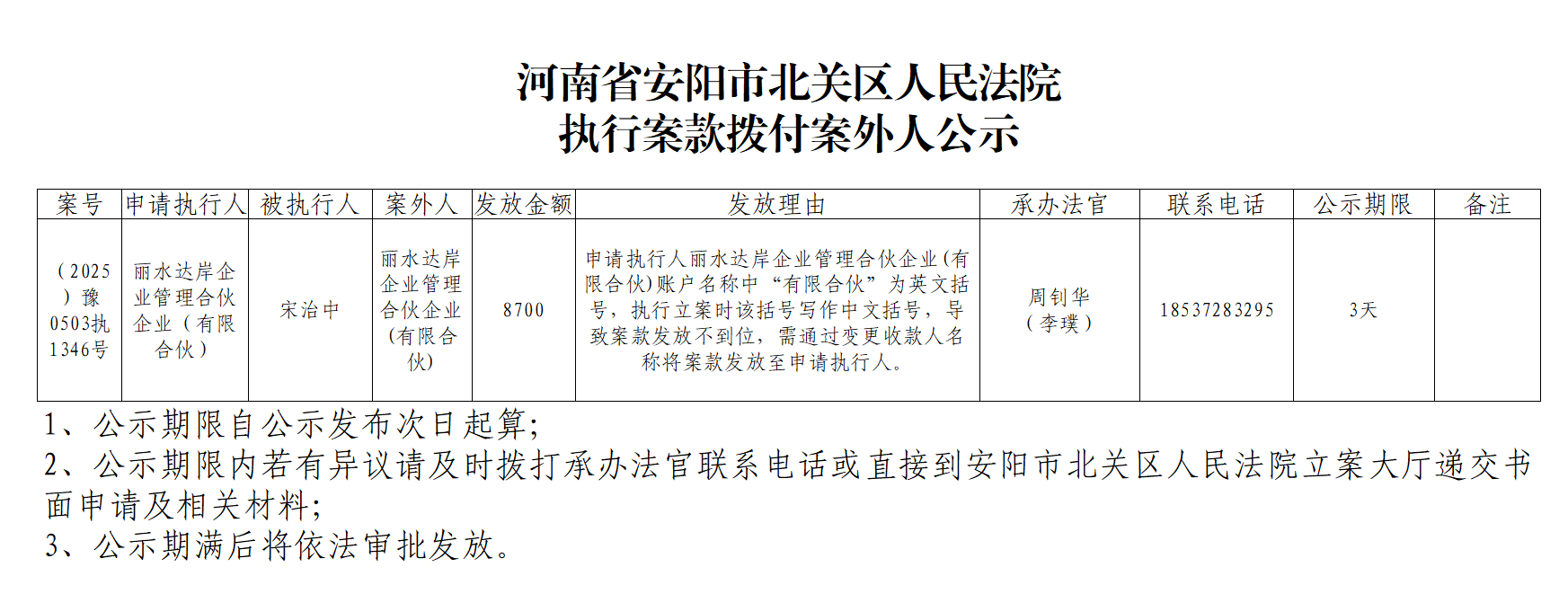 河南省安阳市北关区人民法院执行案款拨付案外人公示
