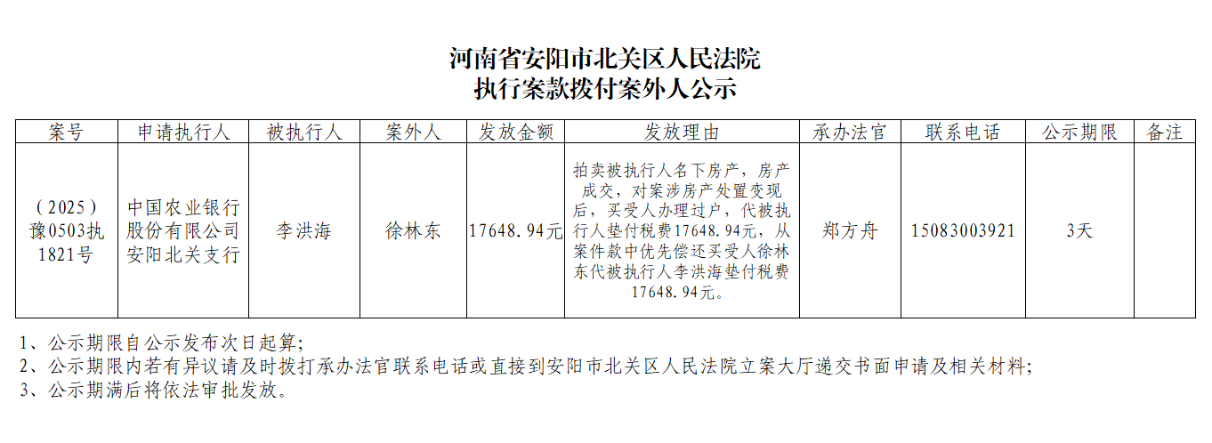 河南省安阳市北关区人民法院执行案款拨付案外人公示
