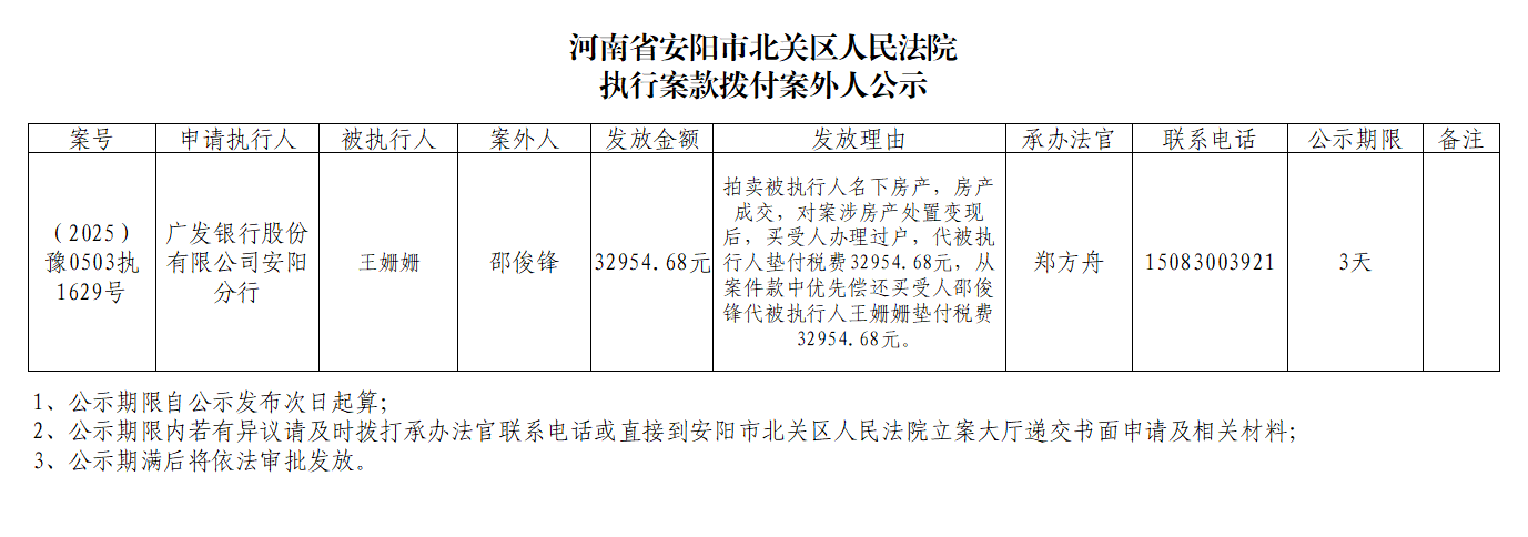 河南省安阳市北关区人民法院执行案款拨付案外人公示