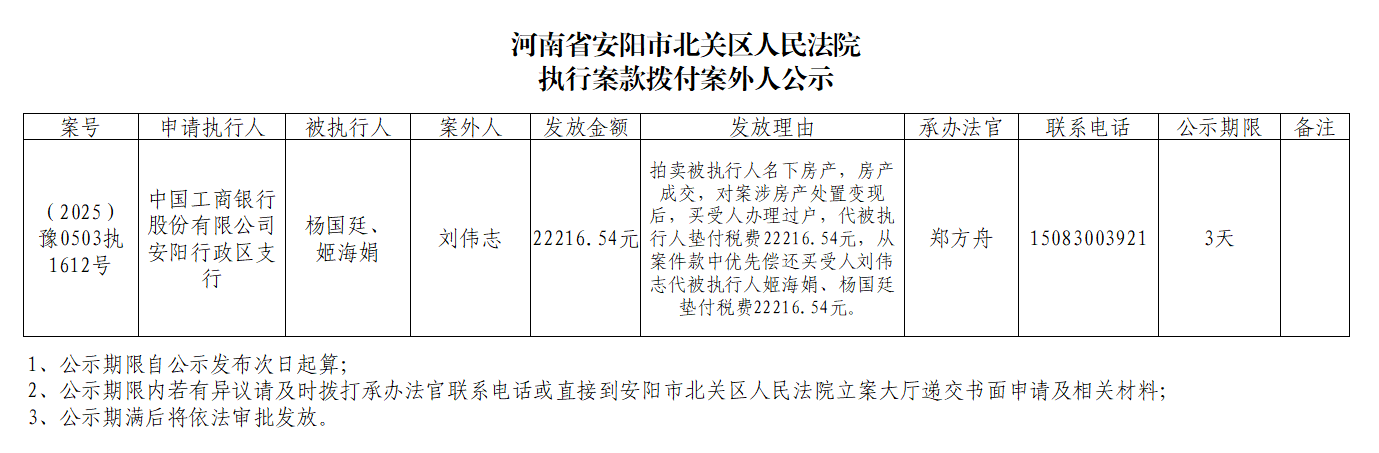河南省安阳市北关区人民法院执行案款拨付案外人公示